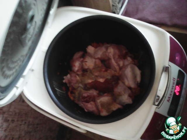 Затем курицу порезать на кусочки, добавить к луку с морковью, туда же томатная паста, солим, перчим и обжариваем курицу мин 15-20