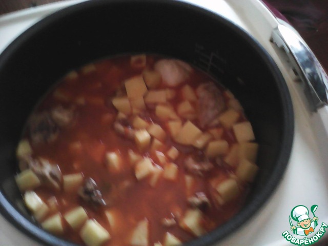 Когда курица обжарилась, добавляем картофель, заливаем водой, чтоб чуть покрывало, солим и ставим в режим "Варка" на 40 мин.