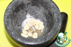 Чеснок почистить, порезать, положить в ступку, добавить щепотку сухого базилика, соль и размягченное сливочное масло.