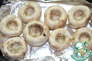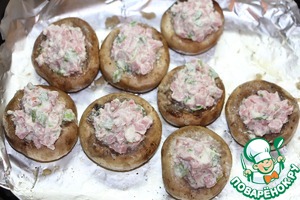 Вытащить из духовки грибы. Духовку не выключать. Дать шампиньонам чуть остыть. Начинить полученной начинкой.
