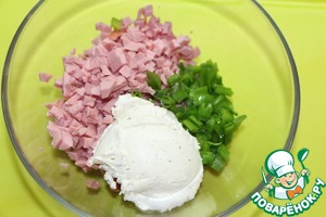 Добавить к колбасе творожный сыр, мелкорубленый зеленый лук, немного посолить и приправить черным свежесмолотым перцем. Перемешать.