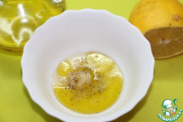 Чеснок измельчить. Смешать все ингредиенты для заправки. Приправить солью и перцем. Мед в данном случае по желанию. Вкусно и с ним и без него.