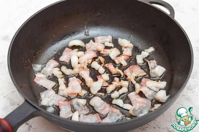 Бекон нарезать и поджарить до сухости и полного вытапливания жира в глубокой сковороде. Убрать подсушенный бекон из сковороды.