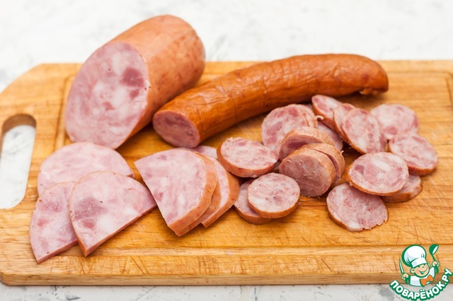 Для этого блюда нужна копченая или полукопченая колбаса, можно нескольких видов. Я использовала колбасу полукопченую "Краковскую традиционную" и немного ветчины "По-Черкизовски", для разнообразия.