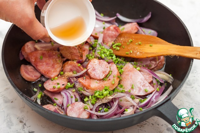 Положить колбаски и лук в сковороду с жиром от бекона, жарить, помешивая, на среднем огне 4-5 минут.