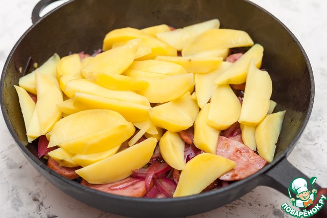 Добавьте картофель, перемешайте, прогрейте и снимите сковороду с огня.