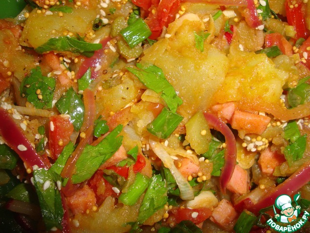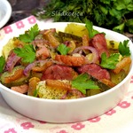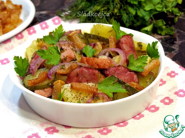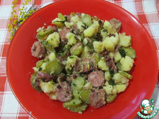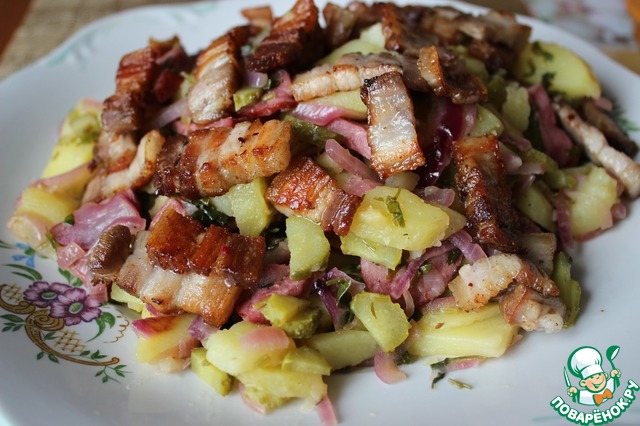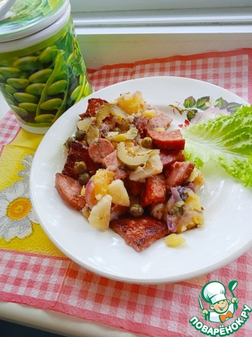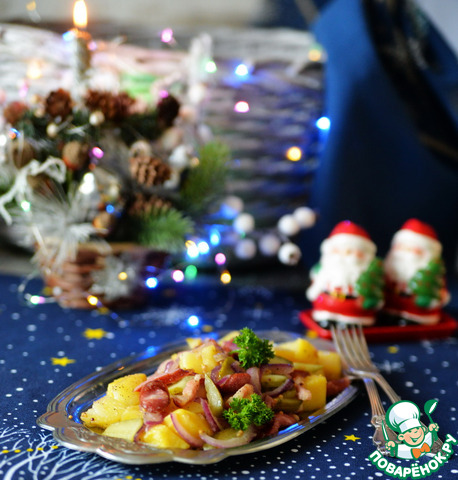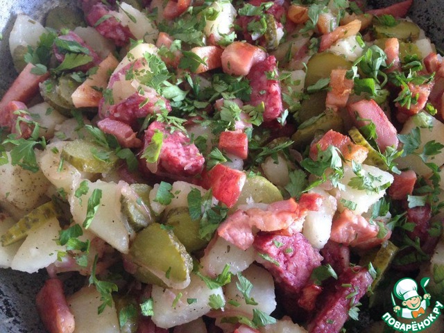 Вкусен и теплый, и холодный! Исключительно гармоничное сочетание копченостей, картофеля и кисло-сладкого вкуса лука!