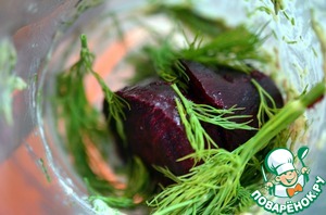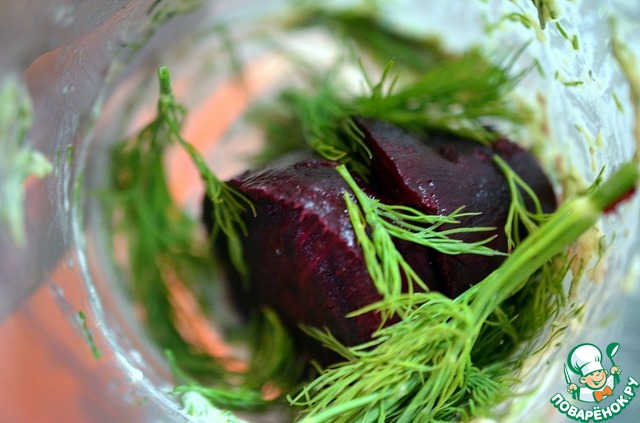 В чашу блендера выложить варёную свеклу, укроп, чеснок.