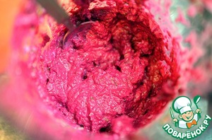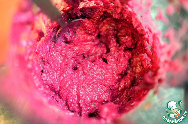 Пюрировать блендером, понемногу добавляя сливки (их может понадобиться больше или меньше, ведь свекла у всех разного размера). Масса должна быть достаточно густой и не растекаться, а держать форму. При необходимости досолить.