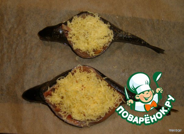 Рыбу положить на бумагу для выпекания, начинить смесью, посыпать тeртым сыром и поставить в духовку.