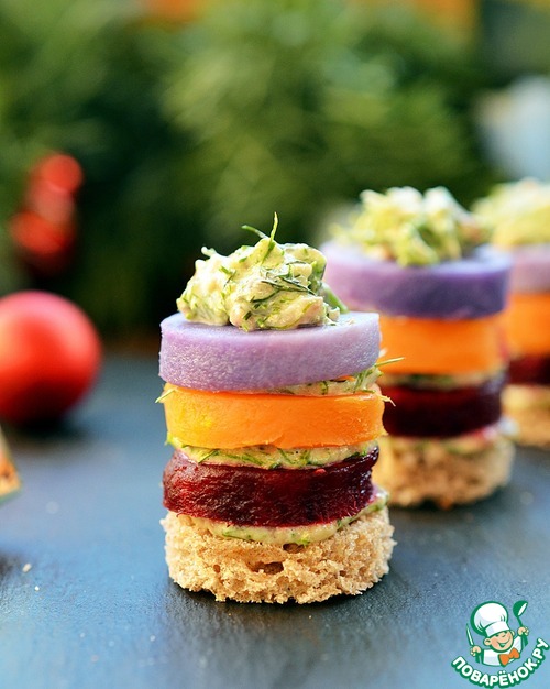 Отвариваем картофель, свеклу и морковь. С помощью кондитерского кольца или рюмки нарезаем овощи кольцами. У меня такой сорт картошки, необычного синего цвета.