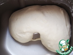 Для приготовления теста я использовала хлебопечку. В ведерко ХП влить теплое молоко, добавить соль, сахар и оливковое масло. Просеять муку с дрожжами, замесить тесто.