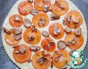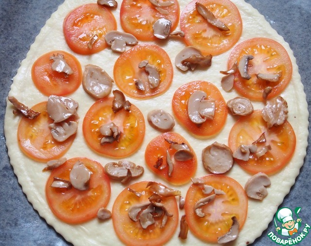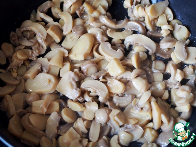 Пока тесто "поднималось", с шампиньонов слить воду и обжарить их на оливковом масле до золотистости.