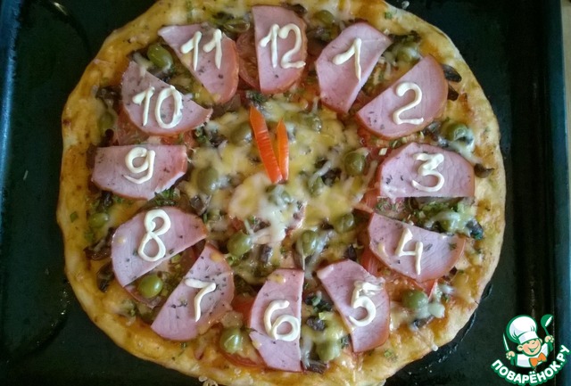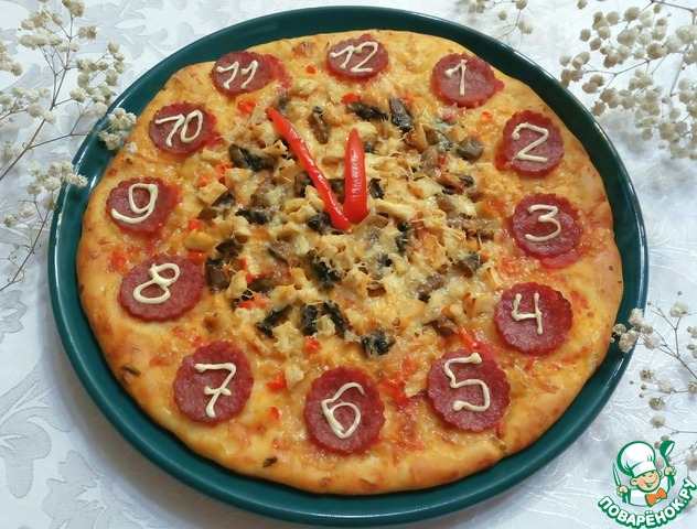 Новый год стремительно приближается, но пока еще есть время поразмышлять, что же готовить на праздничный стол. Предлагаю приготовить пиццу в виде часов, которая обязательно украсит и разнообразит Новогоднее меню.