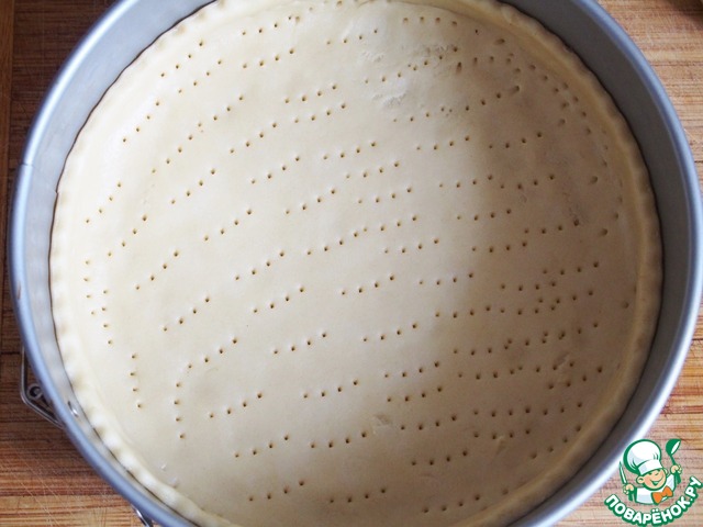Затем распределить тесто в форме для выпечки (у меня диаметр 20 см.), сформировав бортики. Часто наколоть вилкой, чтобы при выпечки тесто не вздумалось. Выпекать в духовке, заранее разогретой до 180 градусов, 12-15 мин.