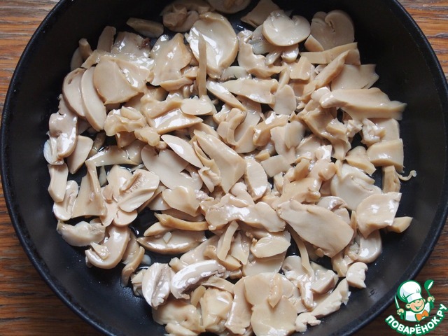 Тем временем с шампиньонов слить жидкость и обжарить их на оливковом масле (2 ст. л.) до золотистости.