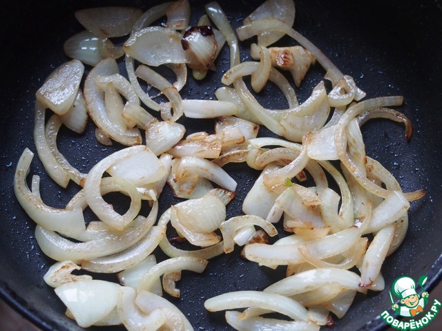 Лук почистить, помыть, нарезать полукольцами и обжарить в оливковом масле (1 ст. л) до золотистости.