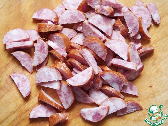 Далее берем колбасу "Краковскую по-Черкизовски", чистим ее.