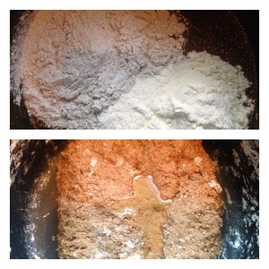 Всыпать оба вида муки и вымешивать тесто. Тесто будет слегка прилипать к рукам. Может показаться, что муки многовато и трудно вымешивать тесто. можно дать ручкам отдохнуть. В конце замеса влить масло и продолжать вымешивать тесто буквально пару минут, пока тесто не вберет в себя масло, и уже перестало липнуть к рукам. Оставим тесто в теплом месте до увеличения в объеме в 2 раза.