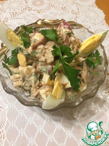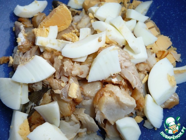 Рыбу нужно предварительно отварить, охладить, снять шкуру, удалить косточки, наломать руками небольшими кусочками.