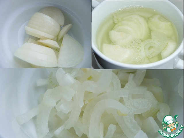 Подготовим лук для салата. У меня горький, если у вас салатный, этот шаг можно пропустить. Лук нарезать полукольцами, залить кипятком на 5 минут, слить воду промыть холодной водой.