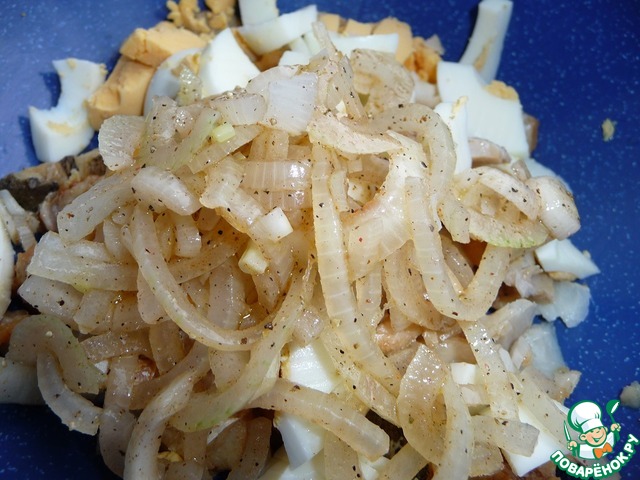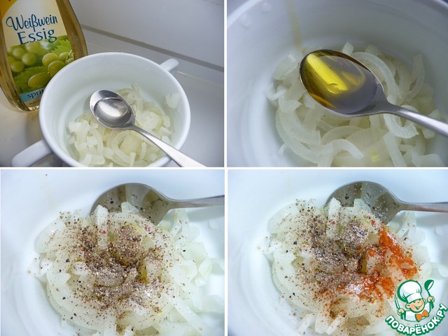 Маринуем лук, влить винный уксус, оливковое масло, добавить свеже-молотый перец, красный перец, немного присолить, перемешать.