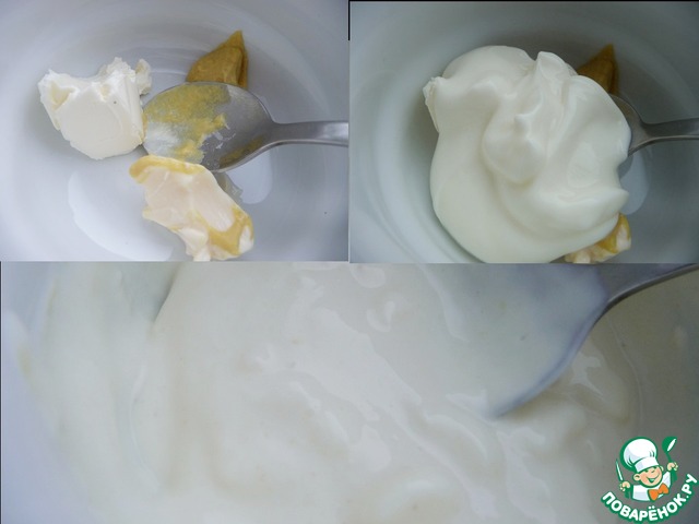Для соуса смешать горчицу, майонез, сливочный сыр, йогурт.