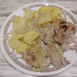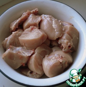 С курицы снимаю кожу и нарезаю порционными кусочками.