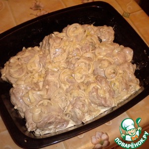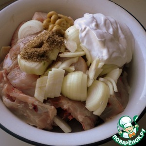 Лук нарезаю полукольцами и отправляю его к курице. Добавляю сметану, горчицу и 1-2 ложечки молотого кориандра. Солю. Хорошенько перемешиваю, чтоб каждый кусочек был промазан равномерно и отправляю в холодильник на час-два-пять. Как получится. Я обычно в обед мариную, а как с работы вечером приду, так уже можно и в духовку курицу отправлять.