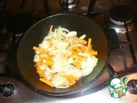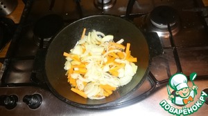 Сковороду - на огонь. Наливаем масло. Даем разогреться и засыпаем лук и морковь. Периодически помешиваем. |