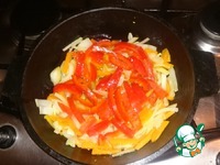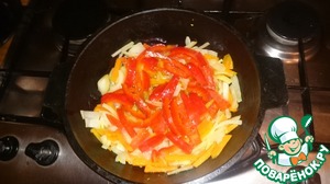 Когда лук станет прозрачным - добавляем болгарский перец. Постоянно помешиваем, чтобы не пригорало. Тушим до размягчения перца и шумовкой перекладываем в миску. |