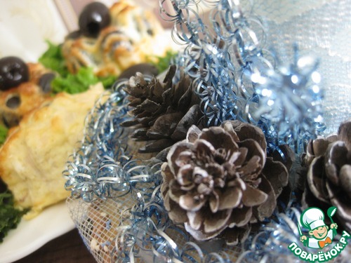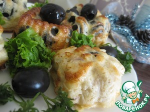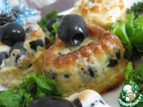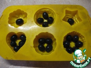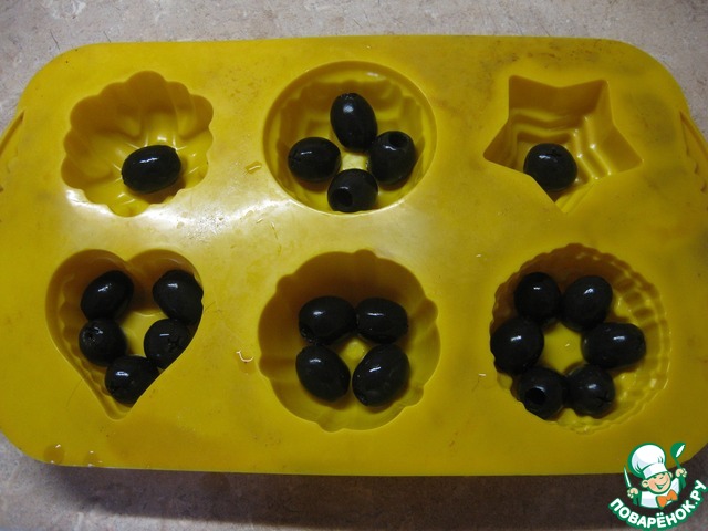 Берем еще 6 формочек (или меньше, это как вы распорядитесь фаршем на первом этапе)), на дно которых выкладываем оливки