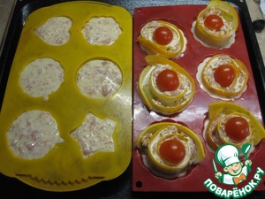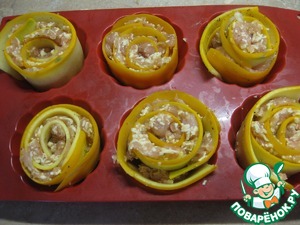 И осторожно выкладываем наш фарш, - у меня получились вот такие две формы по 6 штук, ( тут видна заливка на кабачковых рулетах), на кабачковые рулеты выкладываем по половинке черри.