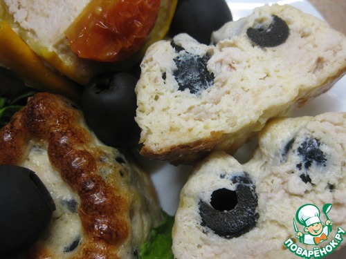 Две закуски почти из одних продуктов, - нежное куриное суфле с оливками внутри -