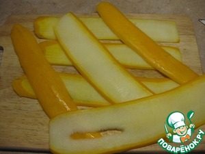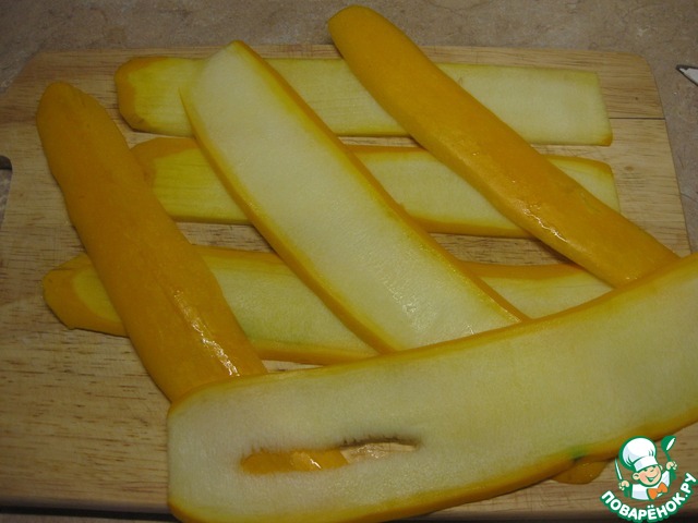 Сначала приготовим кабачковые ленты, я это делаю спец. насадкой на терке, т. к. они будут запекаться, то я с ними ничего предварительно не делаю, только слегка поперчила.