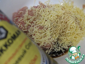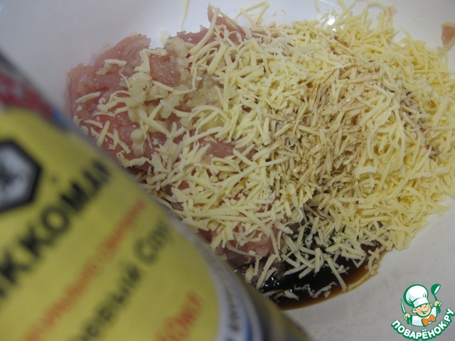 Теперь к фаршу добавляем натертый на мелкой терке сыр, чеснок через пресс и 2 ст. л. соевого соуса, у меня от ТМ Киккоман