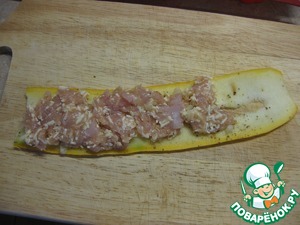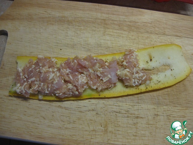 Теперь начинаем выкладывать понемножку фарша на кабачковые ленты (должна уйти примерно половина фарша или чуть больше)