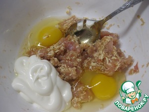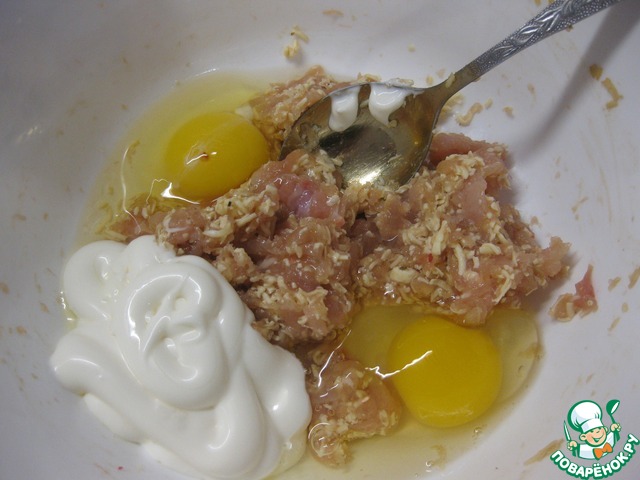 В оставшийся фарш добавляем 2 яйца, 2 ст. л. сметаны и все тщательно взбиваем