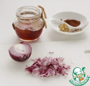Добавить к соусу щепотку соли, пряности и мед, размешать, дать меду разойтись в соусе, выключить огонь. -