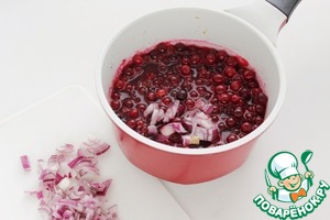 Добавить нарезанную луковицу, перемешать и томить клюквенную смесь на среднем огне 15-20 минут.