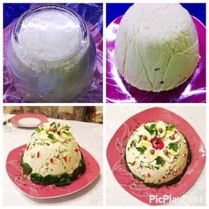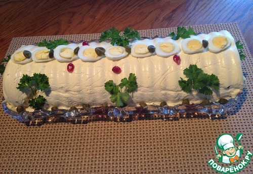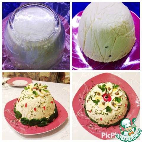 Вынимаем салат из холодильника, накрываем блюдом, на котором подавать будем салат и переворачиваем, освобождаем от пленки и украшаем по своему желанию и фантазии. У меня перепелиные яйца, зелень, каперсы.