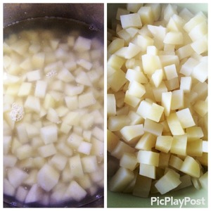 Пока тушится мясо, чистим картофель и нарезаем кубиком. Варим картофель в подсоленной воде с 1 столовой ложкой уксуса. Уксус не позволит картофелю разварится. Откидываем картофель на дуршлаг, даем воде стечь и остужаем. Варим вкрутую яйца, чистим.