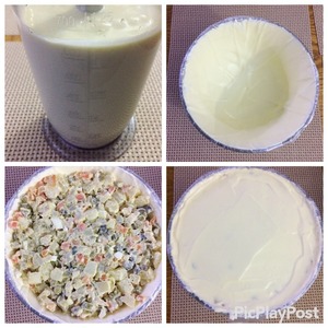 В приготовлении салата используем свой любимый майонез. Часть используем для самого салата, а часть для смазывания формы. Замочить желатин минут на 10. Затем распустить его на водяной бане, остудить. Форму, в которую будем укладывать салат (у меня обычный салатник стеклянный), оборачиваем пленкой и отправляем в морозилку остужаться, она должна быть очень холодной. Смешиваем майонез с остывшим желатином. Вынимаем форму из морозилки. Наливаем майонезное желе в форму и аккуратно тонким слоем распределяем по всей форме. Т. к. форма холодная, то майонез достаточно быстро начнет схватываться. Укладываем салат в форму, сверху распределяем тонким слоем майонез. оборачиваем пленкой и отправляем в холодильник на несколько часов, до полного застывания). У меня из этого количества ингредиентов получилось два салатника для праздничного стола.