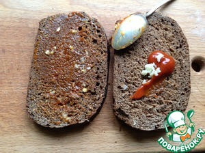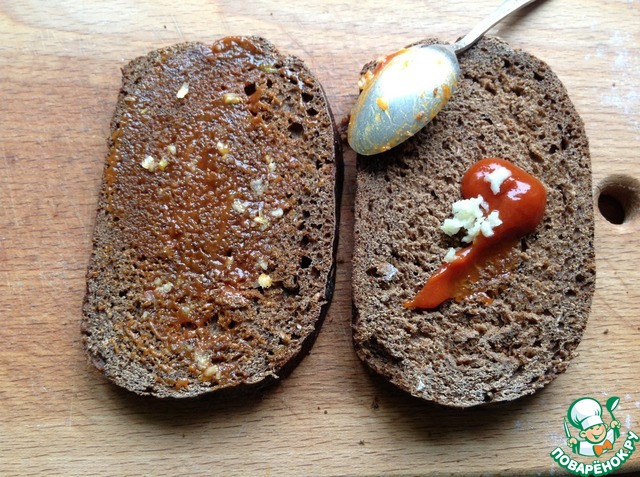 Отрезать кусочки хлеба толщиной 1-1,5 см. Смазать каждый ломтик по 1 ч л кетчупа с перемешкой чеснока пропущенного через пресс.