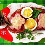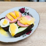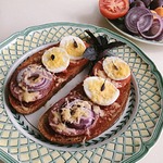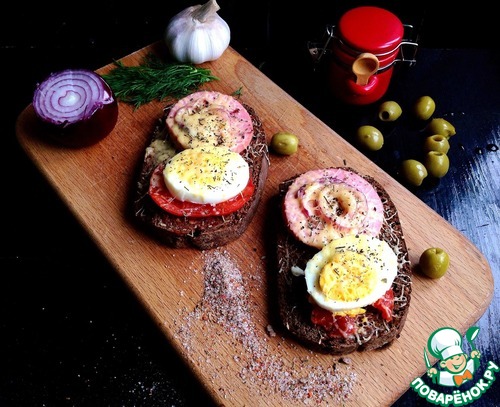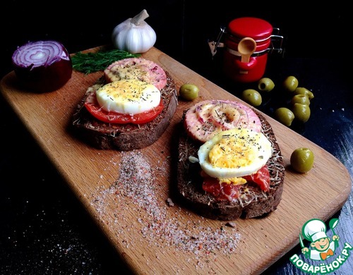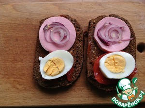 На один край хлеба выложить кругляш колбасы ( у меня вареная) и сверху колечки лука. На другой край хлеба выложить помидор, порезанный колечком и сверху выложить дольку отварного яйца. При желании можно сверху посыпать молотым черным перцем.