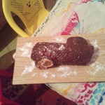 • Для придания рулету вида "полена", срезаем два кусочка, которые крепим к рулету при помощи ганаша. Ганаш на холодном рулете быстро схватывается, поэтому у нас есть возможность придать вид коры нашему "полену". Я это делала вилкой.