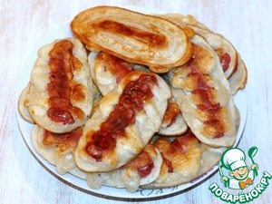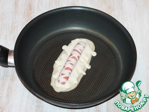 9... и выложить на тесто, немного вдавить её в тесто. Затем сверху на сосиску выдавите зигзагом тесто, дайте немного тесту "схватиться", переверните и обжарьте до румяной корочки.