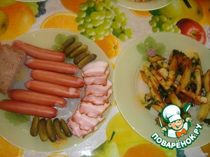 А далее на ваш вкус добавляете к хрустящей картошечке все, что хотите. Муж захотел вот так: ароматное копченое сало, пикантные сосиски, маринованные огурчики. Это его порция:)