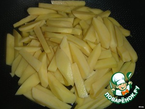 На большой сковороде раскалить много масла и бросить картофель в раскаленное масло. Слегка потрясти сковороду, чтобы все брусочки окунулись в масло, но не мешать лопаткой. По словам мужа, большое количество масла нужно для того, чтобы картофель жарился, а не парился. -