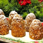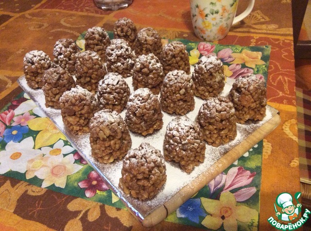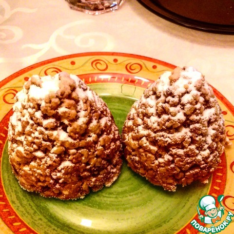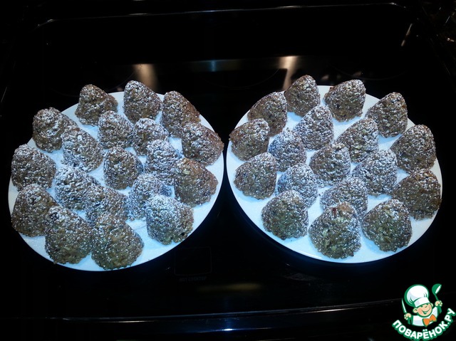 Затем переворачиваем и вытряхиваем шишку из рюмки. Нужна некоторая сноровка, поэтому для начала вытряхивайте печенье на руку, чтобы случайно рюмку не разбить о блюдо и не пораниться. Таким образом поступаем со всем тестом. Наши шишки готовы. Последний штрих — это посыпать сахарной пудрой и "шишки" в снегу готовы. Обычно я готовлю вечером, а утром уже можно их есть. Печенье как-бы немного "цементируется" и не разваливается в руках.